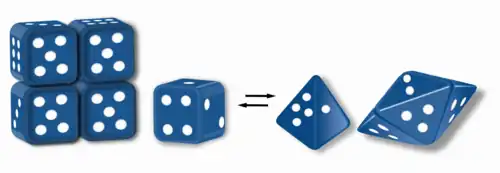 Proteins that function as morpheeins are illustrated using a dice analogy where one dice can morph into two different shapes, cubic and tetrahedral. The illustrated assemblies apply a rule that the dice face with one spot must contact the dice face with four spots. To satisfy the rule for each dice in an assembly, the cubic dice can only form a tetramer and the tetrahedral dice can only assemble to a pentamer. This is analogous to two different conformations (morpheein forms) of a protein subunit each dictating assembly to a different oligomer. All dice in one assembly must be of the same shape before assembly. Thus, for example, the tetramer must come apart, and its component dice must change shape to a pyramid before they can participate in assembly into a pentamer.