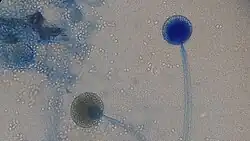 Sporangiophore, sporangium, and spores of Mucor specimen.