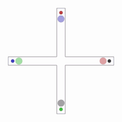 In this mixed sum setting, each of the four agents is trying to reach a different goal. Each agent's success depends on the other agents clearing its way, even though they are not directly incentivized to assist each other.[16]