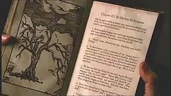 The context for some of these events is provided by the (fictionally used) Gospel of Matthias, a book in Season 2 that connects the Templars to Ben's father.[41] Written in archaic English, reminiscent of the King James Bible translation, it contains parts of Samson's Season 1 prologue, mentions the Avatara, and alludes to an apocalyptic passage in the Book of Revelation.[42] It also contains etchings of a gnarled and bent tree, which in one image is attacked by a Knight Templar holding a knife.[43] Wilfred Talbot Smith interprets this book to Brother Justin, quoting, "By the hand of the Prince, the Prophet dies. Upon his death, the Prince shall rise,"[23] and "[Behold the Usher. A dark heart dwells where branches meet.] Anointed dagger plunge thee deep."[29] Management and Ben repeat these verses independently of Smith.[30][38]