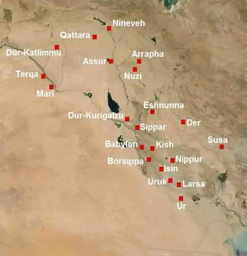 Regardless of his ethnic origin, Nabopolassar appears to have been strongly connected to the city of Uruk,[14][9] located south of Babylon, possibly having been a member of its ruling elite prior to becoming Babylon's king.[9] In a 1998 paper, the Assyriologist Paul-Alain Beaulieu mentioned that there was a growing body of evidence that Nabopolassar's family originated in Uruk, and also presented evidence that several of Nebuchadnezzar II's (Nabopolassar's son and successor) daughters lived in the city.[15] In 2007, the Assyriologist Michael Jursa advanced the theory that Nabopolassar was a member of a prominent political family in Uruk, whose members are attested since the reign of Esarhaddon (r.681–669 BC). To support his theory, Jursa points to a letter from the time of Sinsharishkun, ABL 469, which discusses how the grave and body of Kudurru, a deceased governor of Uruk, was desecrated due to the anti-Assyrian activities of Kudurru's two sons, Nabu-shumu-ukin and a son whose name is mostly missing. The desecration went so far as to drag Kudurru's body through the streets of Uruk. Kudurru can be identified with Nebuchadnezzar (Nabû-kudurri-uṣur, "Kudurru" simply being a common and shortened nickname), a prominent official in Uruk who served as its governor under Ashurbanipal (r.669–631 BC) in the 640s BC.[16]