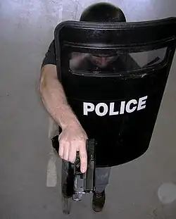 A police officer using a ballistic shield NIJ Level IIIA