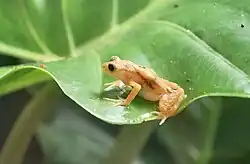The Kihansi spray toad is a small, sexually dimorphic anuran, with females reaching up to 2.9 cm (1.1 in) long and males up to 1.9 cm (0.75 in).[3] The toads display yellow skin coloration with brownish[6] They have webbed toes on their hind legs,[7][6] but lack expanded toe tips.[6] They lack external ears, but do possess normal anuran inner ear features, with the exception of tympanic membranes and air-filled middle ear cavities.[8] Females are often duller in coloration, and males normally have more significant markings [7] Additionally, males exhibit dark inguinal patches on their sides where their hind legs meet their abdomens.[7] Abdominal skin is translucent, and developing offspring can often be seen in the bellies of gravid females.[7] The toad breeds by using internal fertilization, in which females retain larvae internally in the oviduct until their offspring are born.