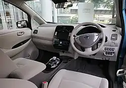In 2009, Nissan unveiled the EV-11 prototype electric car, which was based on the Nissan Tiida hatchback. The prototype featured a substitution of the conventional gasoline engine with an all-electric system, comprising an 80 kW (110 hp)/280 N⋅m (210 lbf⋅ft) electric motor, a 24 kWh lithium-ion battery pack with an estimated range of 175 km (109 miles) on the United States Environmental Protection Agency's LA-4 or "city" driving cycle. Noteworthy features included a navigation system and remote control and monitoring capabilities via a cellphone connection through Nissan's secure data centre to the car.[5] The technology in the EV-11 had previously undergone development and testing in the EV-01 and EV-02 test cars, both equipped with an all-electric powertrain and using the Nissan Cube (Z11) as a development mule.[6][7] The EV-11 prototype was publicly showcased on 26 July 2009.[8] A week later, on 2 August 2009, Nissan unveiled the Leaf at its Yokohama headquarters and committed to initiating retail sales in both the North American market and Japan by the end of 2010.[9][10]