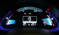 Leaf's main dashboard digital display showing driving range (on right) and other performance parameters