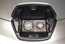 In North America, the Nissan Leaf falls under the classification of a compact car,[56][57][58] while in the UK, it is categorised as a small family car or a C-segment car.[59][60][61] The Leaf's boot/trunk space is rated at 24 cu ft (679.6 L) with rear seats up and 30 cu ft (849.5 L) with rear seats down.[62] The lower portion of the vehicle is equipped with aerodynamic panelling aimed at minimising drag and enhancing overall aerodynamics.[63] Nissan states that the 2011 model year Leaf has a drag coefficient of Cd=0.29 which was further improved to Cd=0.28 in 2012 for the 2013 model year.[64] American automotive magazine Car and Driver, using a wind tunnel, measured a drag coefficient of Cd=0.32 for the 2012 model year Leaf.[65]