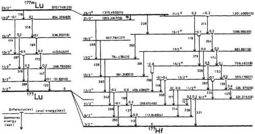 An isotope such as 177Lu releases gamma rays by decay through a series of internal energy levels within the nucleus, and it is thought that by learning the triggering cross sections with sufficient accuracy, it may be possible to create energy stores that are 106 times more concentrated than high explosive or other traditional chemical energy storage.[24]