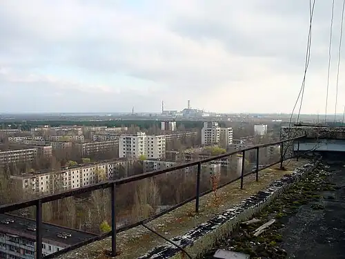 The Ukrainian city of Pripyat abandoned due to a nuclear accident, which took place at Chernobyl Nuclear Power Plant on 26 April 1986, seen in the background.