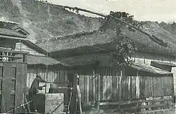 A man at a well, alongside buildings with the thatched roofs, weather-beaten unpainted sides and paper partitions and windows, characteristic of the islands before World War II