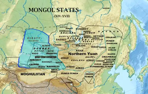 , Dörbön Oyirad; Mongolian: Дөрвөн Ойрад, romanizedDörvön Oirad, pronounced [ˈtɵrw̜ʊ̈ɴ ˈɞe̯ɾ(ə)t]; Chinese: 四衛拉特) or Oirat Confederation, formerly known as the Eleuths, was the confederation of the Oirat tribes which marked the rise of the Western Mongols in the history of the Mongolian Plateau.