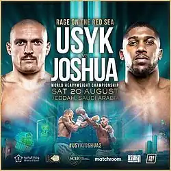 Oleksandr Usyk vs. Anthony Joshua II, billed as Rage on the Red Sea, was a heavyweight professional boxing match between WBA (Super), IBF, WBO, and IBO heavyweight champion, Oleksandr Usyk, and former heavyweight champion, Anthony Joshua. The bout took place on 20 August 2022 at King Abdullah Sports City in Jeddah, Saudi Arabia.[1] Usyk won the 12-round bout by split decision, with scores of 116–112 and 115–113 in his favour, and 115–113 in favour of Joshua.[2]