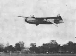 Around 1960, Percival Spencer successfully flew a series of uncrewed ornithopters using internal combustion engines ranging from 0.020-to-0.80-cubic-inch (0.33 to 13.11 cm3) displacement, and having wingspans up to 8 feet (2.4 m).[9] In 1961, Percival Spencer and Jack Stephenson flew the first successful engine-powered, remotely piloted ornithopter, known as the Spencer Orniplane.[10] The Orniplane had a 90.7-inch (2,300 mm) wingspan, weighed 7.5 pounds (3.4 kg), and was powered by a 0.35-cubic-inch (5.7 cm3)-displacement two-stroke engine. It had a biplane configuration, to reduce oscillation of the fuselage.[11]