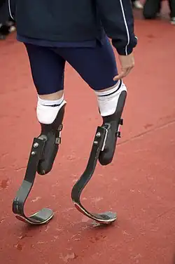 Pistorius competed in T44 (single below-knee amputees) events though he is classified in T43 (double below-knee amputee).[41] Sometimes referred to as the "Blade Runner" (after the science fiction film of the same name) and "the fastest man on no legs",[35][42][43] Pistorius took part in the 2004 Summer Paralympics in Athens and came third overall in the T44[35] 100-metre event.[44] Despite falling in the preliminary round for the 200 metres, he qualified for the final.[45] He went on to win the final in a world record time of 21.97 seconds, beating a pair of American runners, Marlon Shirley and Brian Frasure, both with single amputations.[44]