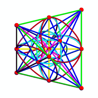 PG(3, 2) can be represented as a tetrahedron. The 15 points correspond to the 4 vertices + 6 edge-midpoints + 4 face-centers + 1 body-center. The 35 lines correspond to the 6 edges + 12 face-medians + 4 face-incircles + 4 altitudes from a face to the opposite vertex + 3 lines connecting the midpoints of opposite edges + 6 ellipses connecting each edge midpoint with its two non-neighboring face centers. The 15 planes consist of the 4 faces + the 6 "medial" planes connecting each edge to the midpoint of the opposite edge + 4 "cones" connecting each vertex to the incircle of the opposite face + one "sphere" with the 6 edge centers and the body center. This was described by Burkard Polster.[4] The tetrahedral depiction has the same structure as the visual representation of the multiplication table for the sedenions.[5]