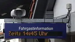 The federal grant came along with a Federal Railway Authority (German: Eisenbahn-Bundesamt (EBA)) order in 2010 to have all stations connected to the travel information system to announce delays with electronic signage or loudspeakers. The Deutsche Bahn operator tried to block that order legally for stations with a very low frequency but lost all lawsuits in 2015.[14] It was given 18 months to equip the remaining stations with DSAs. The DSA system has a GSM radio module to receive a text message to be displayed in a horizontally-moving news ticker style. A loudspeaker may optionally be mounted on top. When there is no delay, the current time is shown statically on its 96×8 LED dot-matrix display.