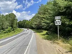 PA 872 begins at an intersection with PA 120 in Grove Township, Cameron County, heading north-northeast on two-lane undivided First Fork Road. The road heads through forested areas, running along the west bank of the First Fork Sinnemahoning Creek. The route runs between tracts of the Elk State Forest, curving to the northeast. PA 872 winds to the north and passes along the western edge of Sinnemahoning State Park, passing near the George B. Stevenson Reservoir. The road continues north-northwest past the state park through forested areas with sparse homes, passing through Lushbaugh and First Fork before turning to the north-northeast.[2][3]