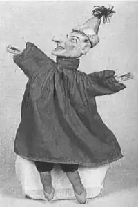 Petrushka (Russian: Петру́шка, IPA: [pʲɪtˈruʂkə] ) is a stock character of Russian folk puppetry. It was first introduced by traveling Italian performers in the first third of the 19th century during a period of Westernization in Russian culture. While most core characters came from Italy, they were soon transformed by the addition of material from the Russian cultural context.'[1] Petrushkas are traditionally hand puppets. The character is a kind of a jester, a slapstick protagonist distinguished by his red dress, a red kolpak, and often a long nose.