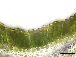 The lamellae, ridges of cells that run along the leaf surface, are crenulate (i.e. with small rounded teeth) in profile and are 5 to 9 cells high. Their margins are distinctly grooved with 2 rows of paired, projecting knobs. The marginal cells, when observed in section, may be narrow, but are more typically enlarged and wider than those beneath. They are retuse (i.e. with a rounded apex with a central shallow notch) to deeply notched, and in rare cases are divided by a vertical partition. These cells are smooth and brownish in colour and have relatively thick cell walls. The sheath cells measure 60 to 90 μm long by 10 to 13 μm wide. These cells may be elongated rectangles or strongly linear structures up to 20 times long as wide. They become narrower toward the margins. Marginal lamina cells are 10 to 15 μm wide and are subquadrate (i.e. nearly square).[3]