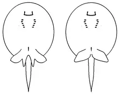 Almost circular in shape, it grows up to 40 cm (16 in) in disc width and 15 kg (33 lb) in weight.[3] The upper surface is covered with denticles (sharp tooth-like scales). The coloration is light brownish with mottled patterns on the dorso, and pink on the ventral side. As with all stingrays, the mouth and gill openings are on the underside, and the eyes and gills exits are on the dorsal side.