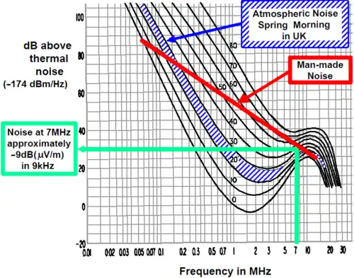 Atmospheric noise and human-caused noise as a function of frequency in the LF, MF, and HF radio spectrum according to CCIR 322.[1] The vertical axis is in decibels above the thermal noise floor. The graph shows that as frequency drops atmospheric noise dominates other sources, and that as frequency rises, although all noise quiets, human-caused noise exceeds atmospheric noise.