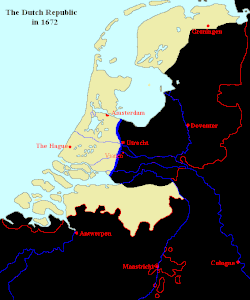 Dutch position in the summer of 1672. Black is the territory held by the French and their allies.