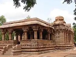 In Karnataka their most famous temples are the Kashivishvanatha temple and the Jain Narayana temple at Pattadakal, a UNESCO World Heritage site.[208][209] Other well-known temples are the Parameshwara temple at Konnur, Brahmadeva temple at Savadi, the Settavva, Kontigudi II, Jadaragudi and Ambigeragudi temples at Aihole, Mallikarjuna temple at Ron, Andhakeshwara temple at Huli (Hooli), Someshwara temple at Sogal, Jain temples at Lokapura, Navalinga temple at Kuknur, Kumaraswamy temple at Sandur, numerous temples at Shirival in Gulbarga,[210] and the Trikuteshwara temple at Gadag which was later expanded by Kalyani Chalukyas. Archeological study of these temples show some have the stellar (multigonal) plan later to be used profusely by the Hoysalas at Belur and Halebidu.[211] One of the richest traditions in Indian architecture took shape in the Deccan during this time which Adam Hardy calls Karnata dravida style as opposed to traditional Dravida style.[212]