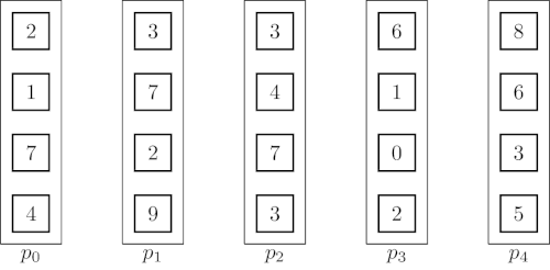 It is important to note that the send and receive operations have to be executed concurrently for the algorithm to work. The result vector is stored at at the end. The associated animation shows an execution of the algorithm on vectors of size four with five processing units. Two steps of the animation visualize one parallel execution step.