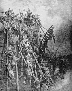Later in 1096, Godfrey of Bouillon also collected tribute from the Jews in Mainz and Cologne, and would have participated in pogroms himself if he had not been ordered by Henry IV not to do so.[29] Saint Louis University Professor Thomas F. Madden, author of A Concise History of the Crusades, claims the Jewish defenders of Jerusalem retreated to their synagogue to "prepare for death" once the Crusaders had breached the outer walls of the city during the siege of 1099.[30] The chronicle of Ibn al-Qalanisi mentions the building was set on fire while the Jews were still inside.[31] The Crusaders were supposedly reported as hoisting up their shields and singing "Christ We Adore Thee!" while they circled the fiery complex."[32] However, a contemporary Jewish letter written shortly after the siege does not mention the burning synagogue. But playing on the religious schism between the two sects of Judaism,[33] Arabist S.D. Goitein speculates the reason the incident is missing from the letter is because it was written by Karaite Jews and the synagogue belonged to Rabbinic Jews.[34]