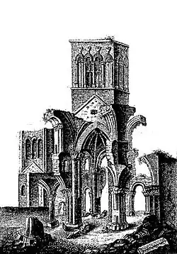 A 19th-century print of the ruins of Montebourg Abbey in Normandy where Richard de Redvers was buried in 1107
