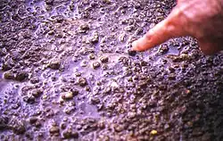 Unfortunately, rills' considerable effect on landscapes often negatively impacts human activity. Rills have been observed washing away archaeological sites.[8] They are also very common in agricultural areas because sustained agriculture depletes the soil of much of its organic content, increasing the erodibility of the soil. Agricultural machines, such as tractors, compact the soil to the point where water flows over the surface rather than seeping into the soil. Tractor wheel impressions often channel water, providing a perfect environment for generating rills. These rills may erode considerable amounts of arable soil if left alone.[9]