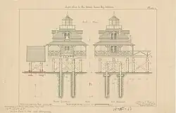 The Roe Island Light was built on Roe Island, in the Suisun Bay across from Port Chicago, 33 miles (53 km) inland from the Golden Gate and five miles (8 km) east of Benicia. Congress approved the construction of the lighthouse in 1888, giving the project 10,000 dollars.[2] Beginning on February 16, 1890, a fixed white light was installed, and ran from that day forward.[3] The lighthouse was featured in the San Francisco Call on April 19, 1896,[4] where the author states that the lighthouse's platform was built fifteen feet above high tide, with the lighthouse being the center of the structure, with two rooms also contained in the structure. The lenses of the lighthouse were manufactured in Paris, France by Sautter & Co. In the 1900s, a second dwelling similar to the lighthouse without the lantern was built adjacent to the lighthouse.