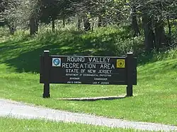 The Round Valley Reservoir in Clinton Township in Hunterdon County, New Jersey, United States, was formed in 1960 when the New Jersey Water Authority constructed two large dams and flooded a large valley. The reservoir is named after the naturally formed circular valley surrounded by Cushetunk Mountain. The deep valley was caused by erosion of the soft sedimentary rock. The surrounding ridges of Cushetunk Mountain endure because they were underlaid with dense and durable volcanic rock diabase that cooled slowly under the surface of the Earth. The reservoir covers what used to be a farming community, with remains of a school and a church on the lake floor among other buildings.[1][2]