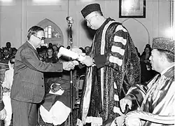 S. M. Ikram receiving an honorary D.Litt. from the Nawab of Kalabagh. Ayub Khan (President of Pakistan) is seated at right.