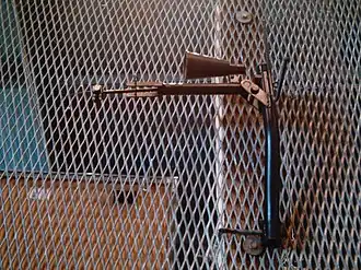 Erich Lutter, an SS leader who headed Department II D 4 (weapons) in the Reich Security Main Office, developed the concept in 1942 for automatic shooting systems on the fences of concentration camps and ghettos known as Scharfschützenmine (Sniper mine). This was intended to prevent prisoners from escaping with minimal personnel expenditure. Lutter's designs were never realized.[3] According to the journalist Georg Bensch, his plans fell into the hands of the victorious Soviet power after the Second World War. In the GDR, these plans were used to develop their own automatic shooting systems. In 1966, the first devices under East Germany were developed with the help of the military technical institute "VUSTE" in Czechoslovakia between Salzwedel and Arendsee, where the automatic firing systems was tested on pigs that were driven into the relevant areas. First fielded in 1970, the mines were cone-shaped, tripwire activated, and mounted to concrete posts along the line of climb-resistant prefabricated steel mesh fence. In some cases, they were mounted directly to the fence itself. They were aimed parallel with the fence line, and intended to kill or incapacitate anyone attempting to climb or cut through the fence.