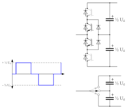 Three-level converters can also be combined with transformers and phase shifting to create additional levels.[19] A transformer with two secondaries, one Wye-Wye and the other Wye-Delta, can be connected to two separate three-phase, three-level converters to double the number of levels. Additional phase-shifted windings can be used to turn the traditional 6 pulses of a three-level to 12, 24, or even 48 pulses.[20] With this many pulses and levels, the waveform better approximates a true sine wave, and all harmonics generated are of a much higher order that can be filtered out with a low-pass filter.