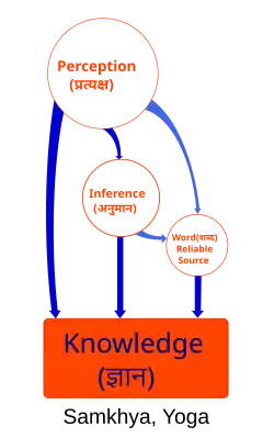 Samkhya's epistemology accepts three of six pramaṇas (proofs) as the only reliable means of gaining knowledge, as does yoga. These are pratyakṣa (perception), anumāṇa (inference) and śabda (āptavacana, meaning, 'word/testimony of reliable sources').[16][17][18] Sometimes described as one of the rationalist schools of Indian philosophy, it relies exclusively on reason.[19][20]