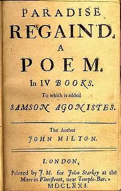 - ^ Milton, John (1671). Paradise Regained; A Poem in IV Books; To Which is Added Samson Agonistes (II ed.). London: John Starkey at the Mittre in Fleetstreet, near Temple Bar. Retrieved 9 October 2023.