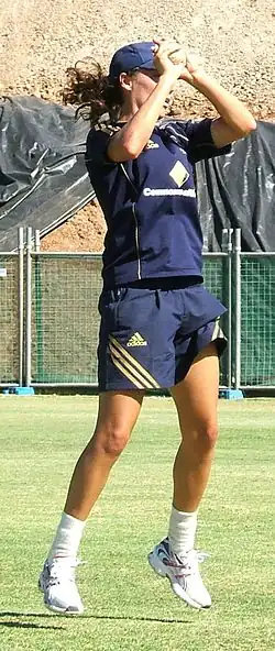 Andrews was rewarded with selection for Australia for the home series against India held in Adelaide at the end of the season. She made her debut in the one-off Test at the Adelaide Oval, and came in at No. 11 after Australia batted first. she made three from six balls before being run out as the hosts made 250.[4] Opening the bowling with Cathryn Fitzpatrick, she took 2/29 from nine overs in the first innings. She had opener Monica Sumra caught by Karen Rolton in her second over, and then trapped the other opener Karu Jain for 21 to leave the Indians at 2/41. In the following over, without further addition to the score, Andrews took her maiden Test catch to dismiss leading Indian batsman and captain Mithali Raj from the bowling of Fitzpatrick. The Indians eventually collapsed to be all out for 93. Australia enforced the follow on and Andrews took 0/19 from 17 overs and caught Sunetra Paranjpe in the second innings as the tourists lost by an innings.[2][4] After missing the first ODI, she made her debut in the second match, coming in at No. 11 and scoring four not out from seven balls in Australia's 173 all out.[2][5] She then took 3/21 from six overs to help secure a 12-run win. In the next match she took 1/33 in a nine-wicket win and ended the series with four wickets at 13.50 and an economy rate of 3.33.[2] Andrews is the 148th woman to play Test cricket for Australia,[6] and the 106th woman to play One Day International cricket for Australia.[6][7]