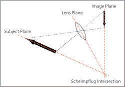 Normally, the lens and image (film or sensor) planes of a camera are parallel, and the plane of focus (PoF) is parallel to the lens and image planes. If a planar subject (such as the side of a building) is also parallel to the image plane, it can coincide with the PoF, and the entire subject can be rendered sharply. If the subject plane is not parallel to the image plane, it will be in focus only along a line where it intersects the PoF, as illustrated in Figure 1.