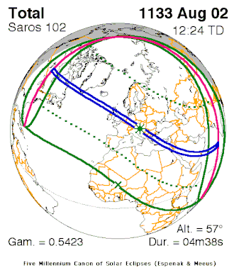 The solar eclipse of August 2, 1133, also known as King Henry's Eclipse, was a total solar eclipse visible in North America, northwestern, central and southeastern Europe and the Middle East. The eclipse is number 43 in the Solar Saros 102 series. The eclipse was widely regarded as a bad omen in England and Germany.