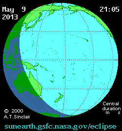 1. ^ a b c "May 9–10, 2013 Annular Solar Eclipse". timeanddate. Retrieved 12 August 2024.