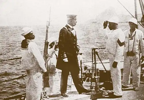 In the aftermath of an 1889 army-led coup d'etat, large portions of Brazil's navy took up arms against the new government in 1891 and 1893–94.[8] The navy's opposition cost it dearly. Despite the naval expansions in Argentina and Chile and the era's rapidly advancing naval technology,[9][B] in 1896 the navy had just forty-five percent of its authorized personnel.[11] Moreover, by the end of the century its only modern armored ships were two small coast-defense vessels.[12] With such dilapidated defenses, José Paranhos Jr., the Baron of Rio Branco and Foreign Minister of Brazil, opined that Brazil's only remaining protection was "the moral force and old prestige still left" from Brazil's imperial era.[13][C]