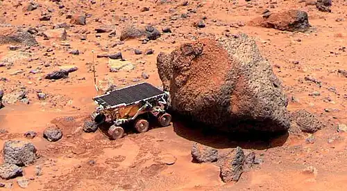Sojourner takes its Alpha particle X-ray spectrometer measurement of Yogi Rock on Mars.