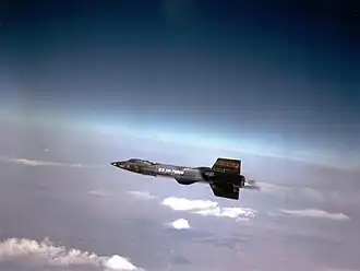 The North American X-15 in flight. X-15 flew above 100 km (62 mi) twice and both of the flights were piloted by Joe Walker (astronaut).