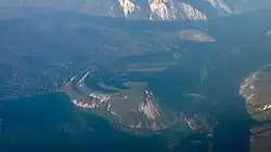 Aerial view of Spiral Butte. Dog Lake sits at the base of the butte.