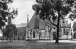 On 29 August 1850, The Right Reverend Charles Perry, Bishop of Melbourne, laid the foundation stone for a rectangular ironstone church, designed by architect, Melbourne city surveyor and St Andrew's parishioner, Charles Laing.[8] This building was erected to the north-west of the St Andrew's Graveyard, featured plastered brick reveals and trims, was Gothic Revival in style and included a tower that was never built in the scheme. Seating 250 people, it was opened on 12 October 1851 by The Revd William Brickwood, Vicar from 1849 to 1853. In the late 1920s, the present Vicarage was built on the site of this second church building.[3]