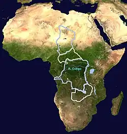 The Central African musicological region and the River Congo upon a satellite photograph showing the African tropical rainforest and desert regions