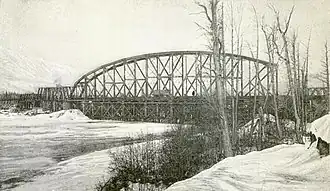The Susitna River Bridge, also known as the Gold Creek Bridge, was the longest bridge span on the United States Government Railway in Alaska. The steel 504-foot (154 m) through-truss channel spans the Susitna River. It was completed in February, 1921. The crossing of the Susitna includes two 121-ft. combination Howe truss flanking spans and two 70-foot (21 m) combination pony Howe truss end spans, with 392 feet (119 m) of trestle at the southern approach and 28 feet (8.5 m). at the northern approach, making a total length of 1,322-foot (403 m). It is located 150 miles (240 km) north of Anchorage, and 264 miles (425 km) north of the terminus at Seward.[2] The bridge was listed on the National Register of Historic Places in 1977.[1]