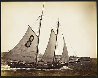 According to Samuel Eliot Morison, the Sylph won the first recorded American yacht race[3] on August 3, 1835. The race was held at Martha's Vineyard and sponsored by the Southern Massachusetts Yacht Racing Association, between the ninety-two foot yacht Wave, owned by John Cox Stevens and the sixty-foot yacht Sylph. The race started off Vineyard Sound, then around Block Island and finished off Naushon Island.[4] William Carlton Fowler took charge of the pilot-boat Sylph,[5] and skippered the Sylph at the 1835 yacht race.[2]