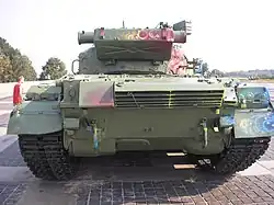 A prototype version of Oplot tailored for evaluation by the Turkish Army (prototype designation, KERN2-120).[25] Mounts a 120 mm main gun which fires both 120 mm NATO rounds (like the M829 DU series) and a special 120 mm version of the AT-11 Sniper ATGM. Most significantly, the Yatagan features a completely redesigned "Cassette style" bustle mounted autoloader,[26] similar to the ones used on Leclerc and K2 Black Panther, replacing the Soviet-era carousel autoloader. This redesign allows all ammunition in the ready-rack to be separated from the crew and equipped with blowout panels, features considered standard for NATO MBTs. It also has automated gear shifting in place of a mechanical gear selector, driver's T-bar control replacing tiller bars, air conditioning, and projectile muzzle velocity sensor, and differences in the fire control system, communications, etc.